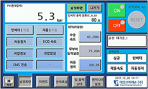 | 설비특성 | 정압제어, 고속 공회전 방지, 자동정지&스타트, 바이패스,기능 수도운전 모드, 연동제어, 안전보호기능 |